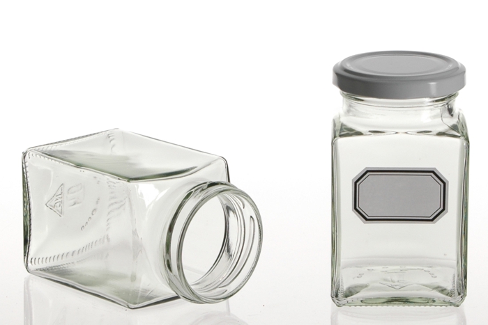 Schraubglas 4-Eckig58er Twist-Off Deckel in weiss, schwarz oder Silber.(ohne Etikette)